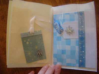 Find a cheap photo album with inserts (I bought one from the dollar store with 20 pages in it) I could make four books with that! Take the pages out, trim 12 x 12 paper slightly larger than pages, sew down the left side to make a "bound" book. Make sure when stitching on paper you set the stitches to wide (otherwise the paper falls off - experience). Attach some buttons (I sewed mine on by hand with embroidery floss) attach more floss to back with a brad or button and leave room to wind around front button and hang a little so you can attach your tag.